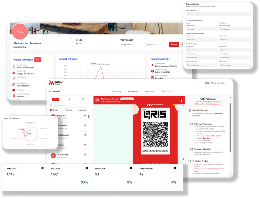 Dengan Innovasia, Anda cukup berkomunikasi dan melayani. Setiap interaksi akan otomatis tersimpan, diprofilkan, dan disegmentasi oleh sistem kami—siap pakai untuk retensi, analisis, hingga strategi pemasaran berikutnya.